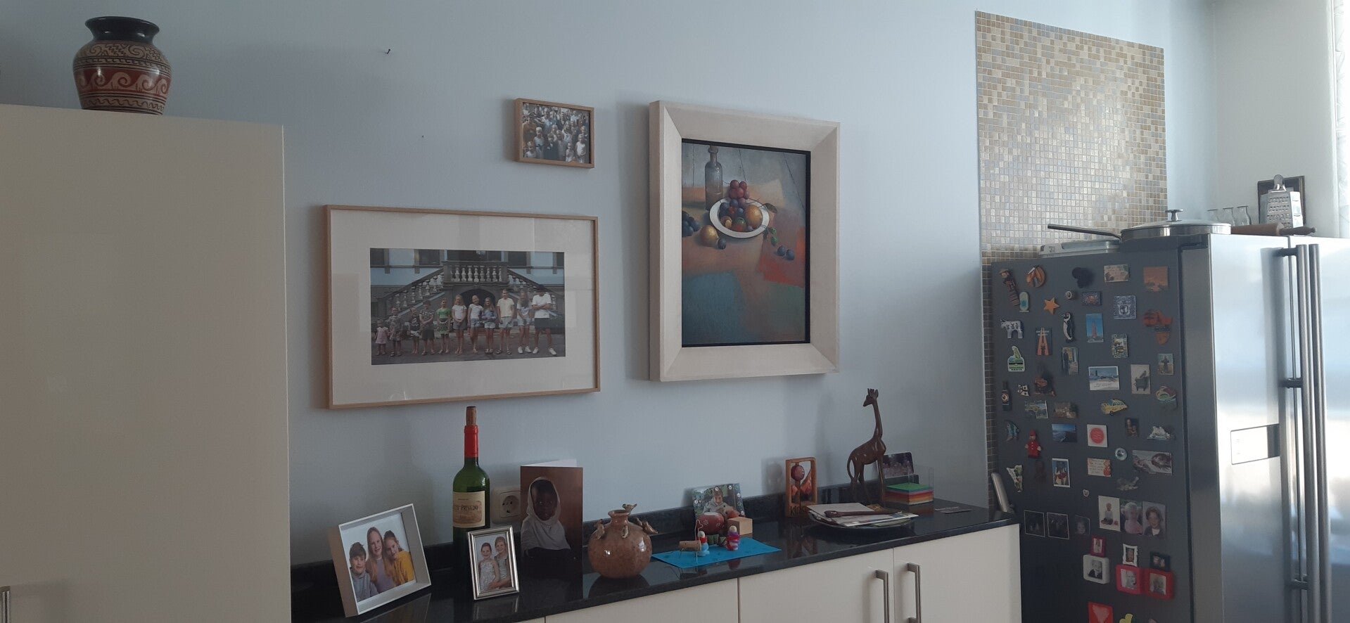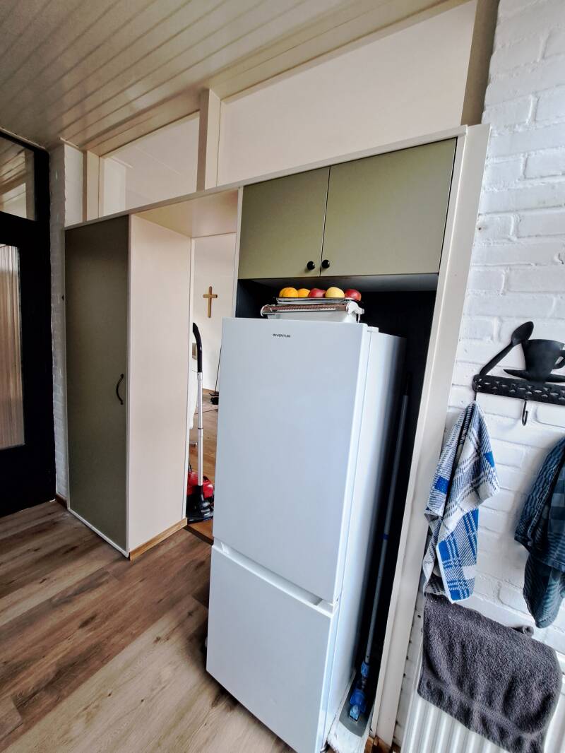 Situatie ná, met maatwerk kast uitgevoerd met open eiken nis-kasten en inbouwkoelkast,