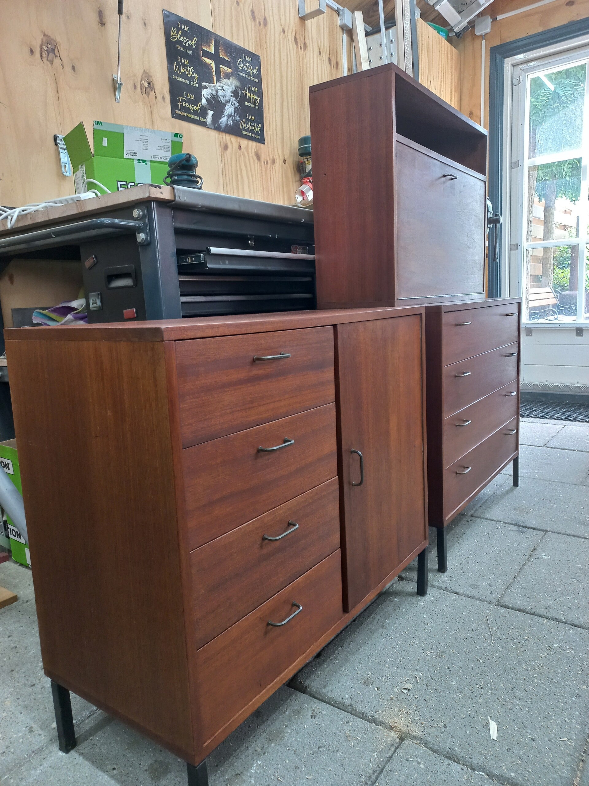 een verbrede vensterbank, zwevende planken, haardomlijsting en 2 deuren onder de trap.