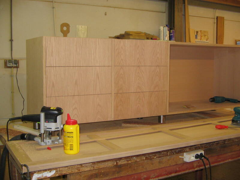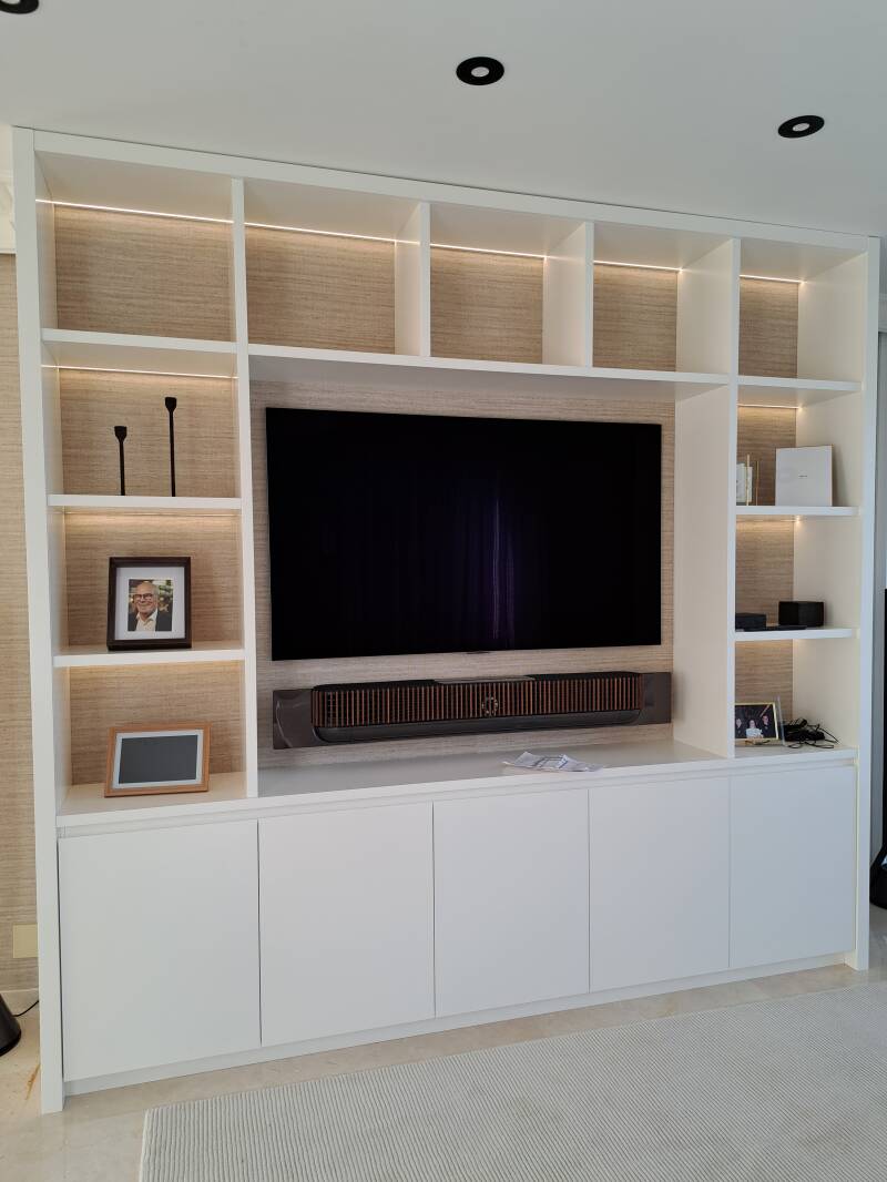 Zwevend audio- tv-meubel met schuifdeur en lade.